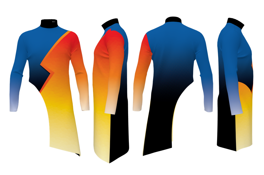 This Digital Print Uniform features a bold and energetic design, perfect for commanding attention on the field or stage. A striking zigzag line sharply divides the torso, creating dynamic color blocks of vibrant blue, warm orange, and bright yellow. The upper blue section incorporates a sophisticated halftone dot pattern that gradually fades into a deep black, which also forms a dramatic curved panel along the lower body. This design can be applied to any silhouette and recolored to any color! Contact us to get started and request a quote!