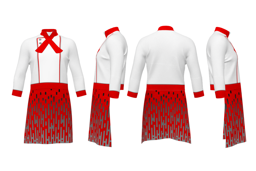 This striking design features a pristine white long-sleeve top accented with vibrant red trim along the placket, collar, cuffs, and a bold scarf detail at the neckline. The modified drop or apron showcases a dynamic pattern of varying gray vertical dashes and lines against a rich red background, creating a modern, textured effect that adds visual intrigue. This uniform is perfect for commanding attention in both indoor and outdoor performances. This design can be applied to any silhouette and recolored to any color!