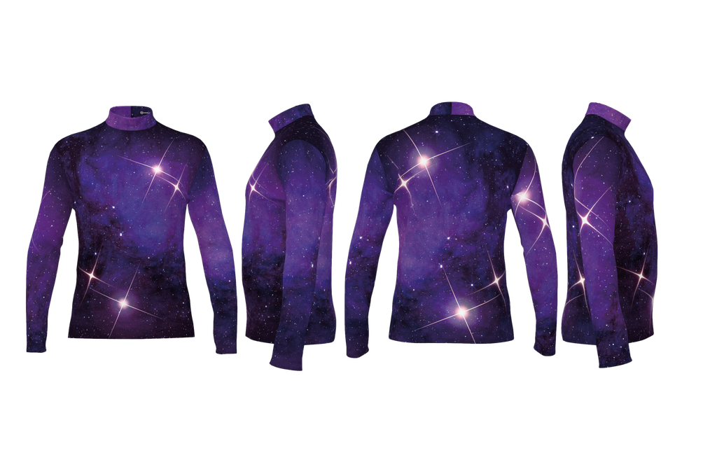 This stunning Digital Print Uniform features a vibrant and deep cosmic galaxy design that immediately captures attention. The uniform showcases rich hues of deep purple and various shades of blue, mimicking the vastness of space. Bright, sparkling stars with distinct cross-shaped flares are scattered across the fabric, adding a dynamic and ethereal glow to the celestial backdrop. Designed for maximum visual impact, this uniform ensures performers stand out with a truly out-of-this-world aesthetic. This design can be applied to any silhouette and recolored to any color!